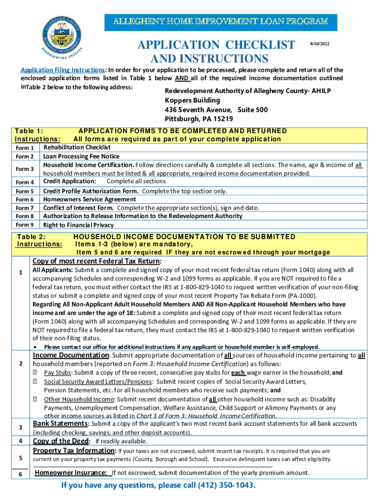 ALLEGHENY HOME IMPROVEMENT LOAN PROGRAMAPPLICATION CHECKLIST AND INSTRUCTIONS8/10/2022Application Filing Instructions: In order for your application to be processed, please complete and return all