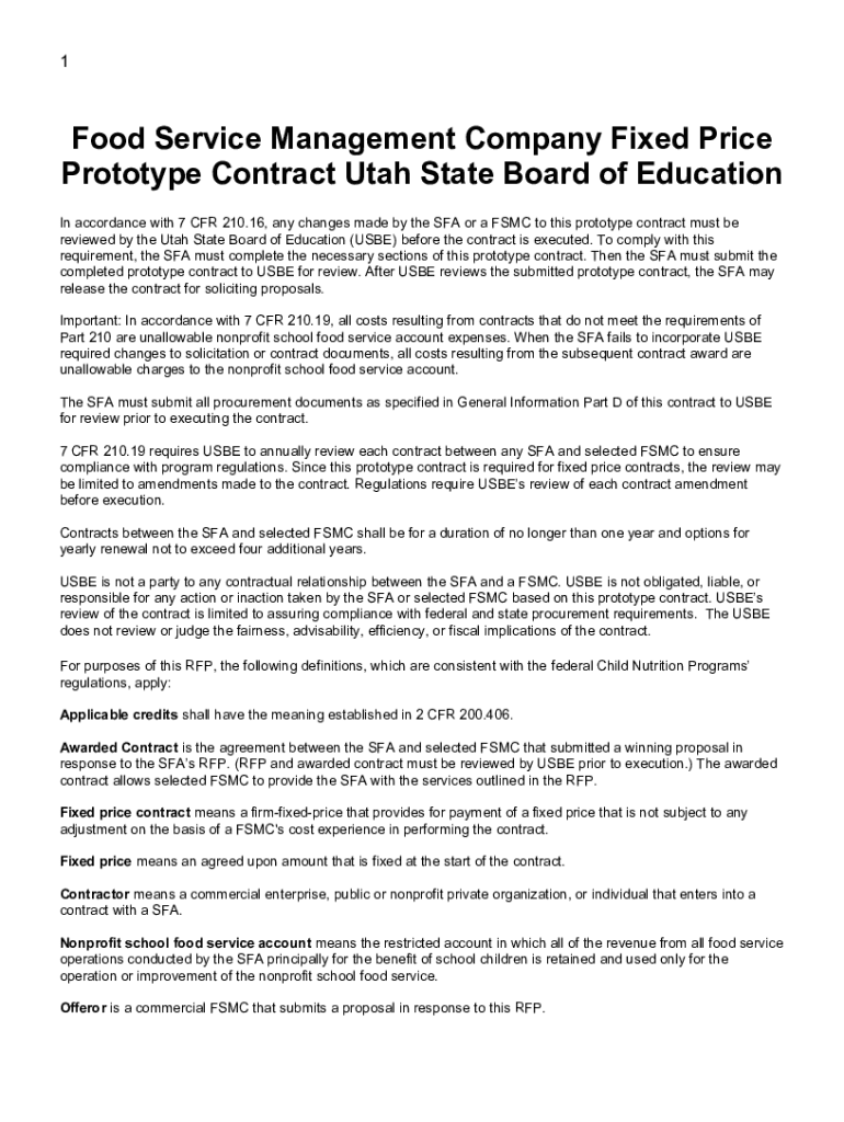 1Food Service Management Company Fixed Price Prototype Contract Utah State Board of Education In accordance with 7 CFR 210.16, any changes made by the SFA or a USMC to this prototype contract must