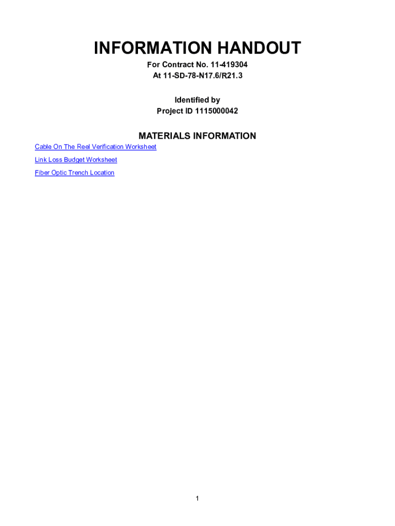 INFORMATION HANDOUT For Contract No. 11419304 At 11SD78N17.6/R21.3 Identified by Project ID 1115000042MATERIALS INFORMATION Cable On The Reel Verification Worksheet Link Loss Budget Worksheet Fiber