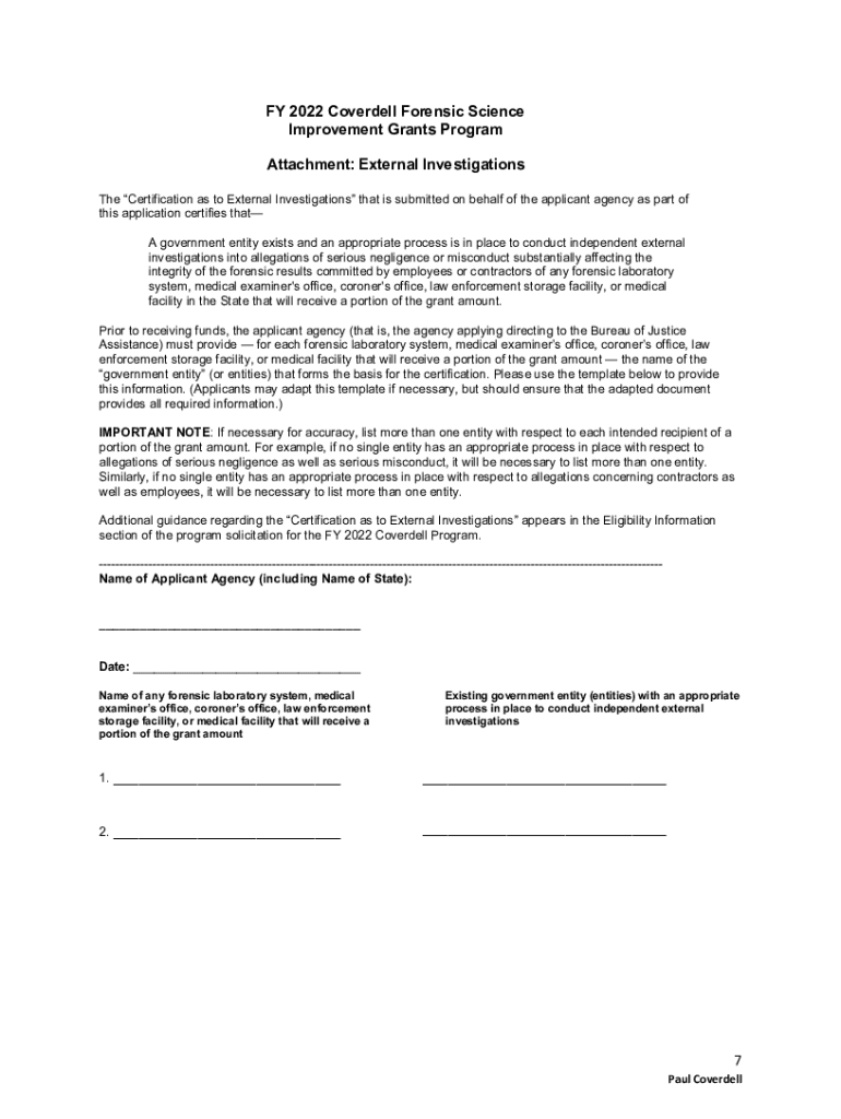 FY 2022 Cover dell Forensic Science Improvement Grants Program Attachment: External Investigations The Certification as to External Investigations that is submitted on behalf of the applicant agency