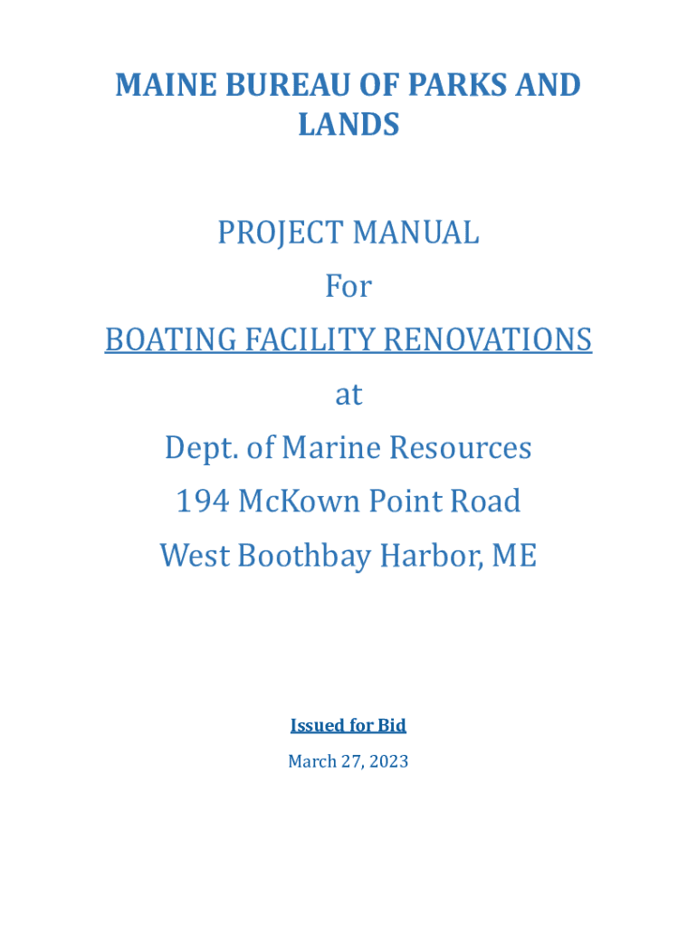 West Booth bay Harbor, Reissued for Bid March 27, 2023PROJECT MANUALForBOATING FACILITY RENOVATIONSatDept. Of Marine Resources194 McGown Point Road