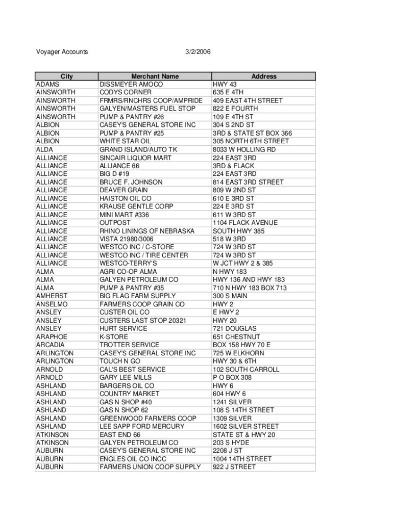 Voyager AccountsCity ADAMS AINSWORTH ALBION ALBION ALBION ALMA ALLIANCE ALLIANCE ALMA ALMA ALMA AMHERST ANSELMO AINSLEY AINSLEY AINSLEY ARAPAHOE ARCADIA ARLINGTON ARNOLD ASHLAND ATKINSON AUBURN AUBURN3/2/2006Merchant