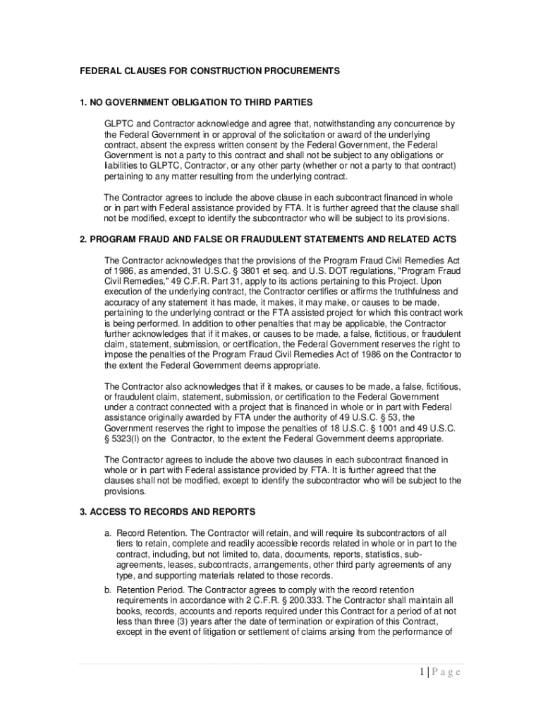 FEDERAL CLAUSES FOR CONSTRUCTION PROCUREMENTS1. NO GOVERNMENT OBLIGATION TO THIRD PARTIES GLP TC and Contractor acknowledge and agree that, notwithstanding any concurrence by the Federal Government