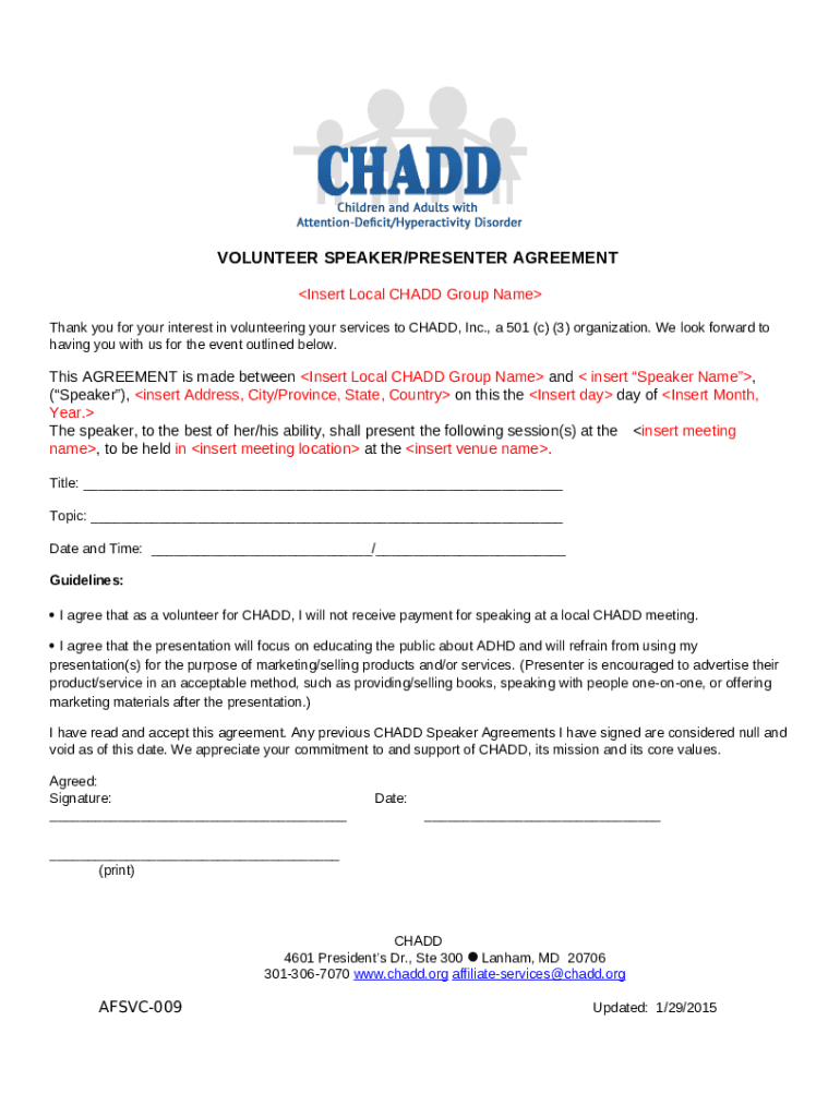 How should you fill out the Volunteer Speaker/Presenter Agreement template
