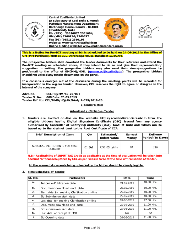 Central Coalfields Limited (A Subsidiary of Coal India Limited) Materials Management Department Darshan House, Ranchi 834001 (Jharkhand), India pH: (PBX): 2361687/ 2361694; GM (MM) 2360716/2360257