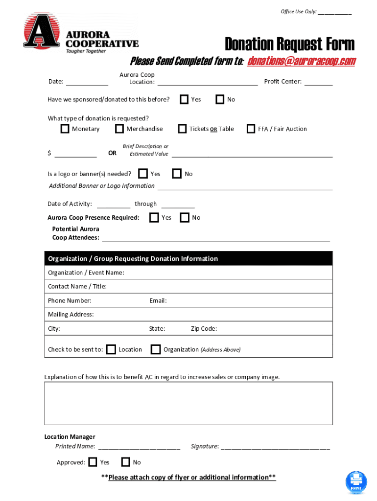 Office Use Only: ___Donation Request Form Please Send Completed form to: donations@auroracoop.com Date:/Aurora Coop Location:/Profit Center:Have we sponsored/donated to this before? What type of donation