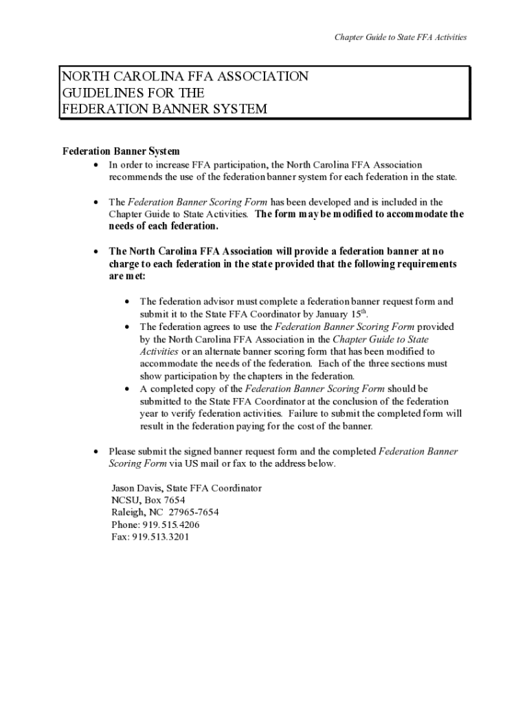 Chapter Guide to State FFA ActivitiesNORTH CAROLINA FFA ASSOCIATION GUIDELINES FOR THE FEDERATION BANNER SYSTEM Federation Banner System In order to increase FFA participation, the North Carolina