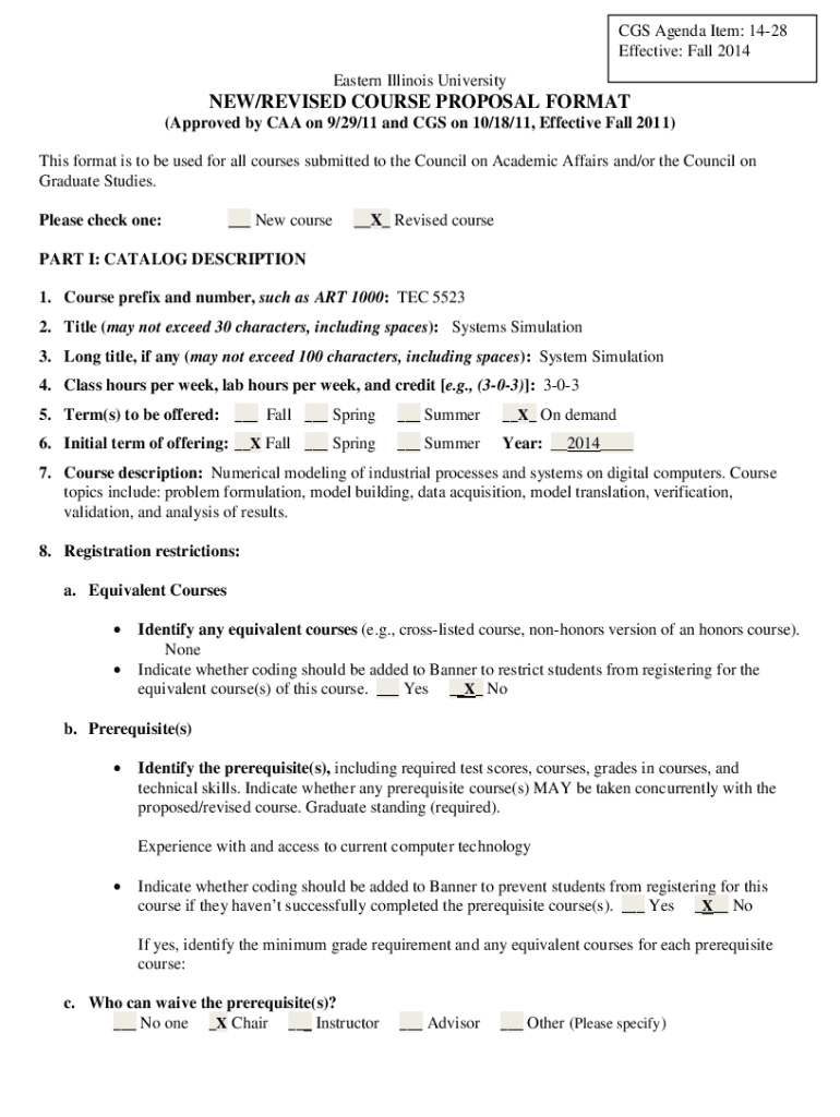 CGS Agenda Item: 1428 Effective: Fall 2014 Eastern Illinois University/REVISED COURSE PROPOSAL FORMAT (Approved by CAA on 9/29/11 and CGS on 10/18/11, Effective Fall 2011) This format is to be used