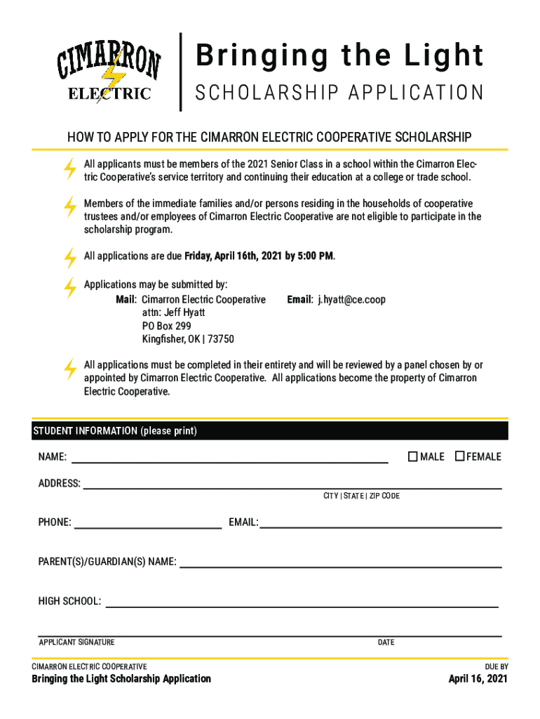 Brain gin g the Light S C H O L A R S H I P A P P L I C AT I O N HOW TO APPLY FOR THE CIMARRON ELECTRIC COOPERATIVE SCHOLARSHIP All applicants must be members of the 2021 Senior Class in a school