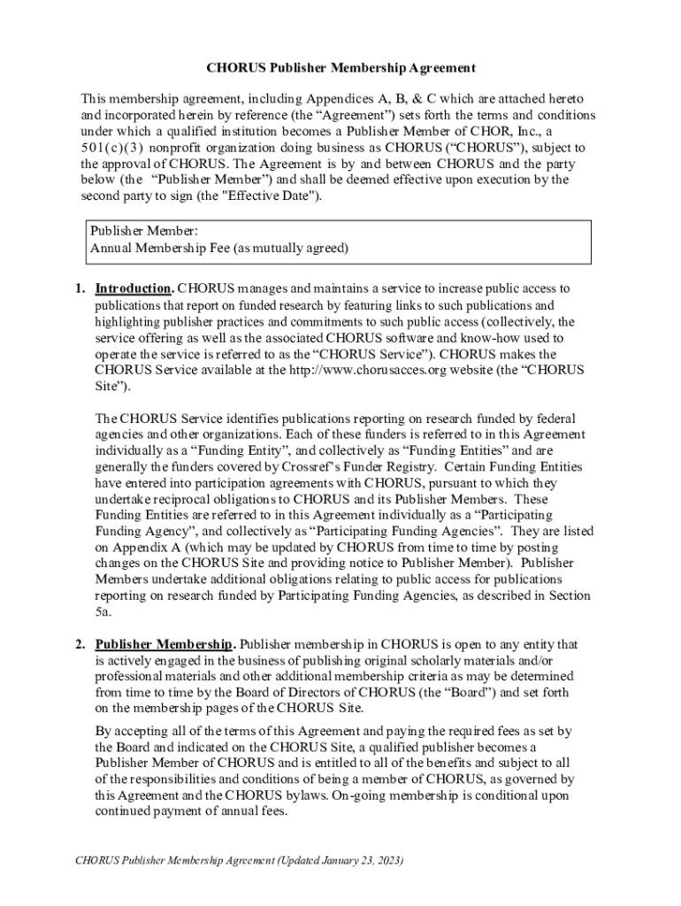 CHORUS Publisher Membership Agreement This membership agreement, including Appendices A, B, & C which are attached hereto and incorporated herein by reference (the Agreement) sets forth the terms