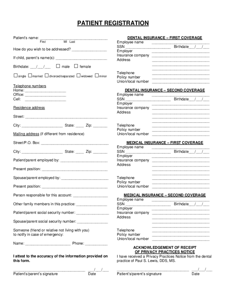 PATIENT REGISTRATION Patients name: ___ First MI Last do you wish to be addressed? ___ If child, parents name(s): ___ male female Birthdate: ___/___/___singlemarrieddivorced/separatedwidowedminorTelephone