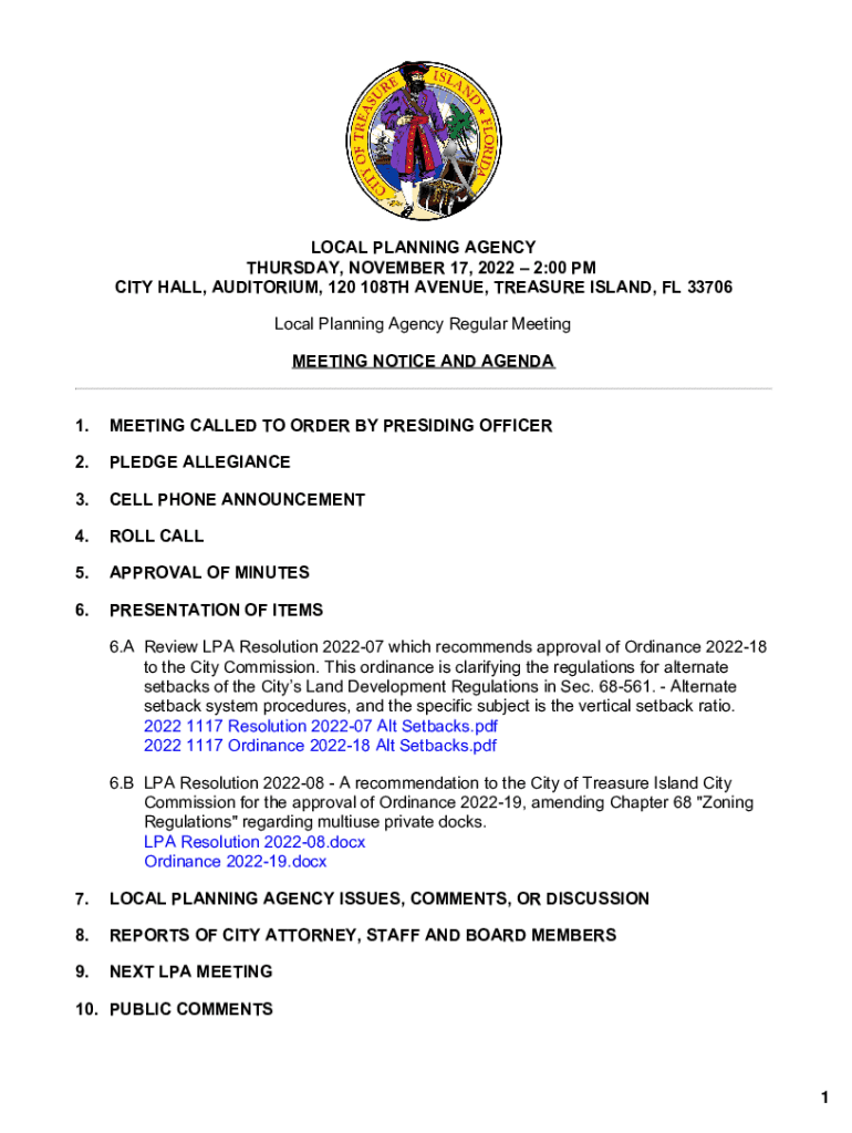 LOCAL PLANNING AGENCY THURSDAY, NOVEMBER 17, 2022 2:00 PM CITY HALL, AUDITORIUM, 120 108TH AVENUE, TREASURE ISLAND, FL 33706 Local Planning Agency Regular Meeting NOTICE AND AGENDA1.MEETING CALLED