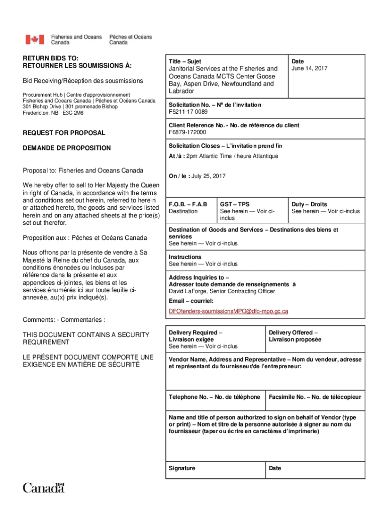 RETURN BIDS TO: RETURNER LES COMMISSIONS : Bid Receiving/Reception DES sous missions Procurement Hub | Center dapprovisionnement Fisheries and Oceans Canada | Ache set Cans Canada 301 Bishop Drive