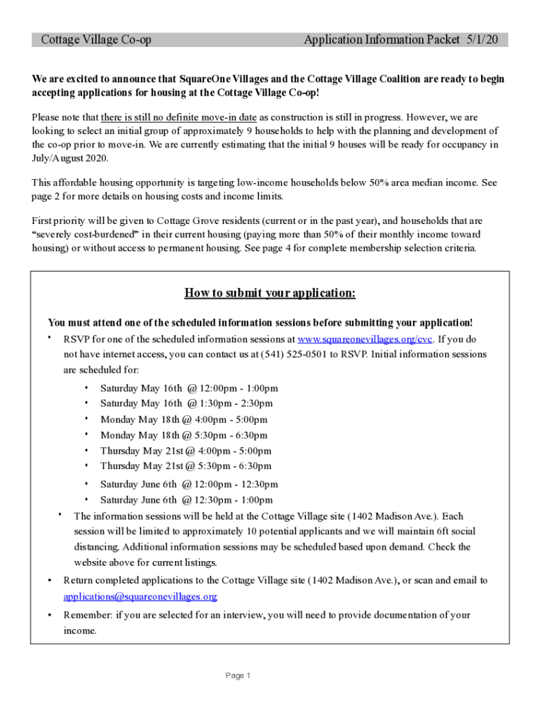 Cottage Village CoopApplication Information Packet 5/1/20We are excited to announce that Square Villages and the Cottage Village Coalition are ready to begin