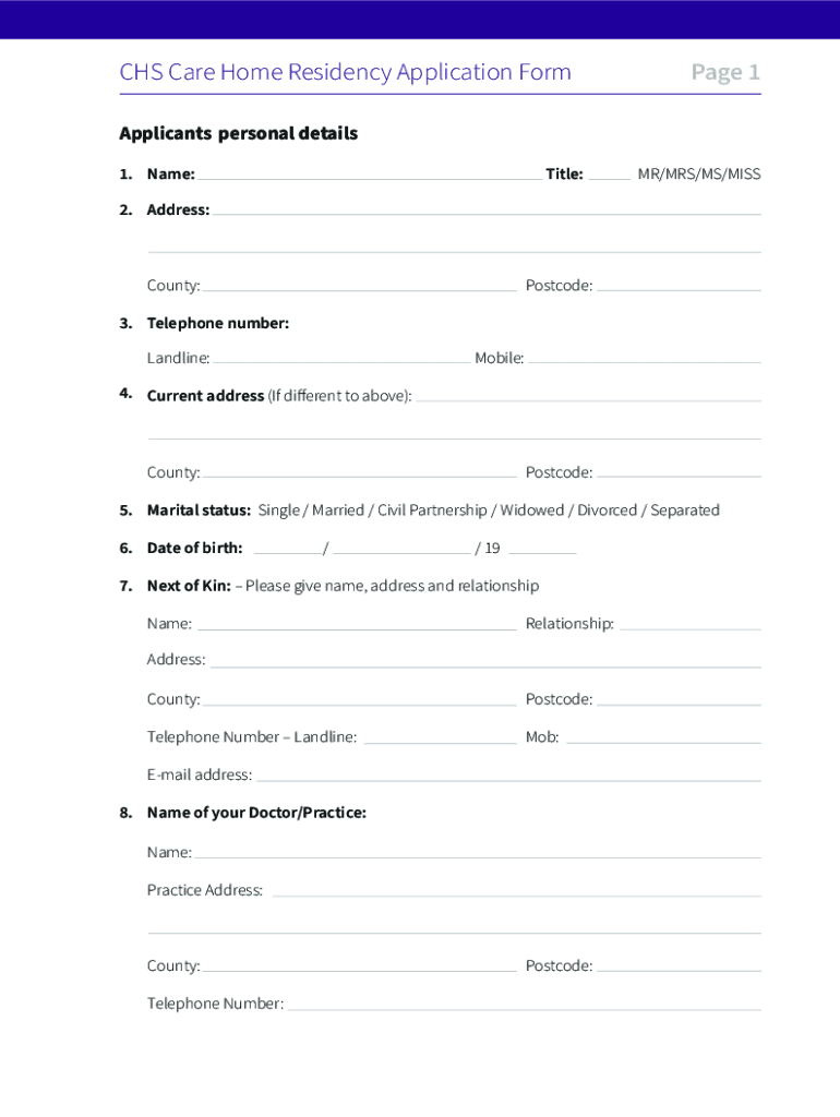 CHS Group Care Home Residency Application Form CHS Care Home Residency Application Form Page 1Applicants personal details 1. Name:Title:MR/MRS/MS/MISS2. Address:County:Postcode:3. Telephone number: