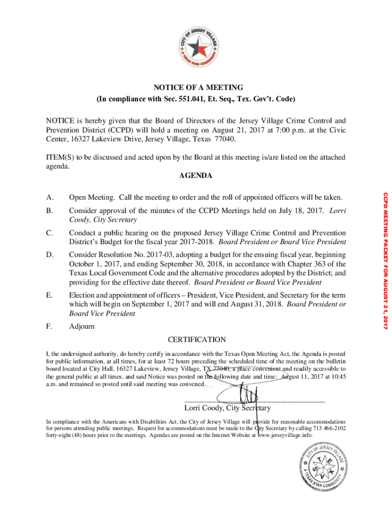 NOTICE OF A MEETING (In compliance with Sec. 551.041, ET. Seq., Tex. Govt. Code) NOTICE is hereby given that the Board of Directors of the Jersey Village Crime Control and Prevention District (CCPD)