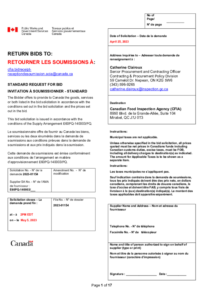 No of Page/___N de predate of Solicitation Date DE la demand April 25, 2023RETURN BIDS TO: RETURNER LES COMMISSIONS :Catherine Clairol Senior Procurement and Contracting Officer Contracting & Procurement