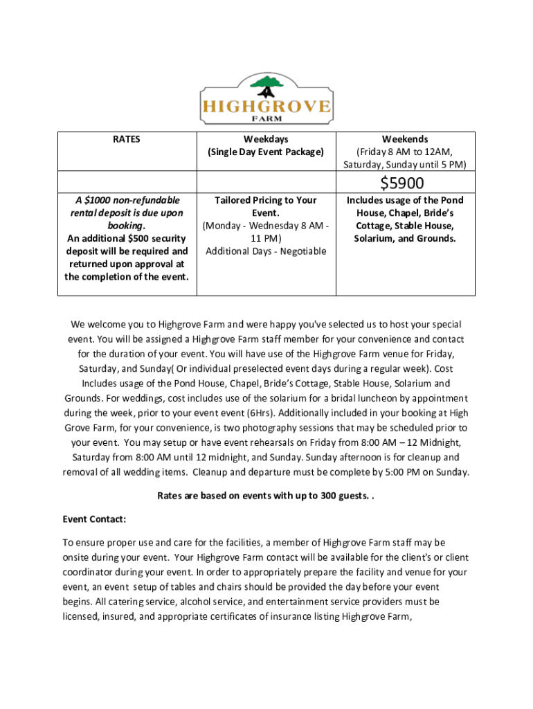 RATESWeekdays (Single Day Event Package)A $1000 nonrefundable rental deposit is due upon booking. An additional $500 security deposit will be required and returned upon approval at the completion