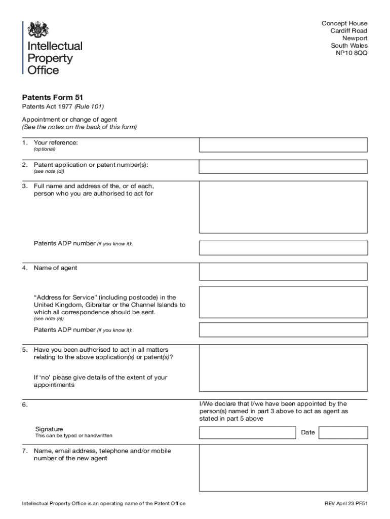 Concept House Cardiff Road Newport South Wales NP10 8QQPatents Form 51 Patents Act 1977 (Rule 101) Appointment or change of agent (See the notes on the back of this form) 1. Your reference: (optional)2.
