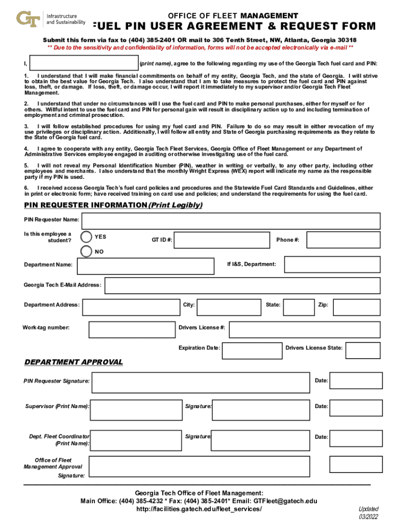 OFFICE OF FLEET MANAGEMENTFUEL PIN USER AGREEMENT & REQUEST FORM Submit this form via fax to (404) 3852401 OR mail to 306 Tenth Street, NW, Atlanta, Georgia 30318 ** Due to the sensitivity and confidentiality
