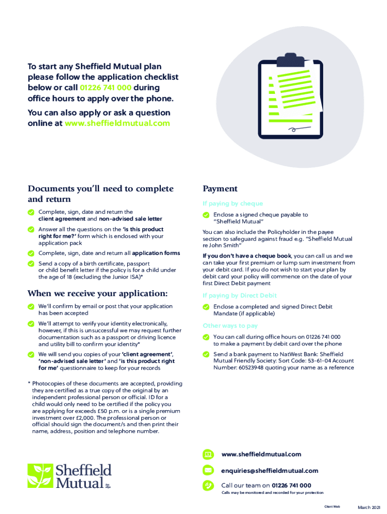 To start any Sheffield Mutual plan please follow the application checklist below or call 01226 741 000 during office hours to apply over the phone. You can also apply or ask a question online at www.sheffieldmutual.comDocuments
