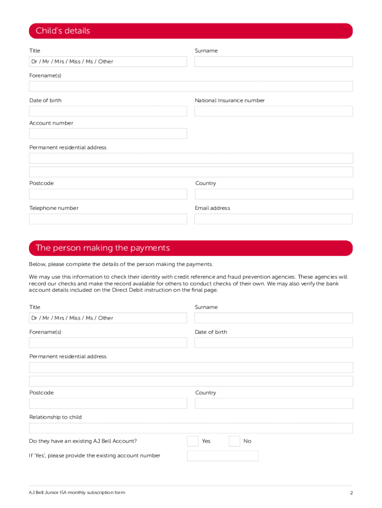 Junior Monthly subscription form This is an application form for someone other than the registered contact to pay a monthly subscription to a Junior ISA. You'll also need to use this form if you're