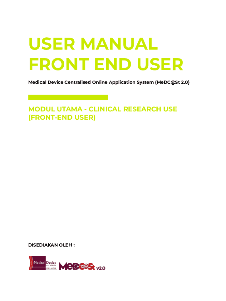 USER MANUAL FRONT END USER Medical Device Centralized Online Application System (MEDCs 2.0)MODEL UT AMA CLINICAL RESEARCH USE (FRONTEND USER)DISEDIAKAN OLE :Medical Device Authority, Ministry of Health