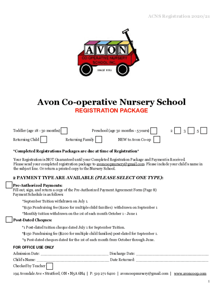 ACTS Registration 2020/21Avon Cooperative Nursery School REGISTRATION PACKAGEToddler (age 18 30 months) Returning ChildPreschool (age 30 months 5 years) Returning Family235NEW to Avon Coop×Completed