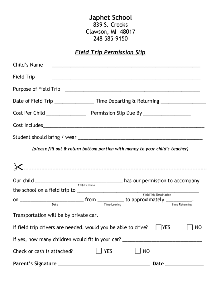 Safe School 839 S. Crooks Clawson, MI 48017 248 5859150 Field Trip Permission Slip Child's Name___Field Trip___Purpose of Field Trip ___ Date of Field Trip ___ Time Departing & Returning ___ Cost