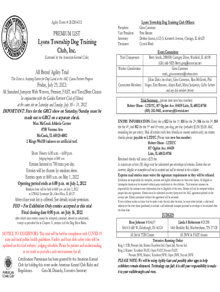 Agility Event # 2022054312PREMIUM LIST Lyons Township Dog Training Club, Inc. (Licensed by the American Kennel Club)All Breed Agility TrialPresident: Vice President Secretary: Treasurer:Lyons Township