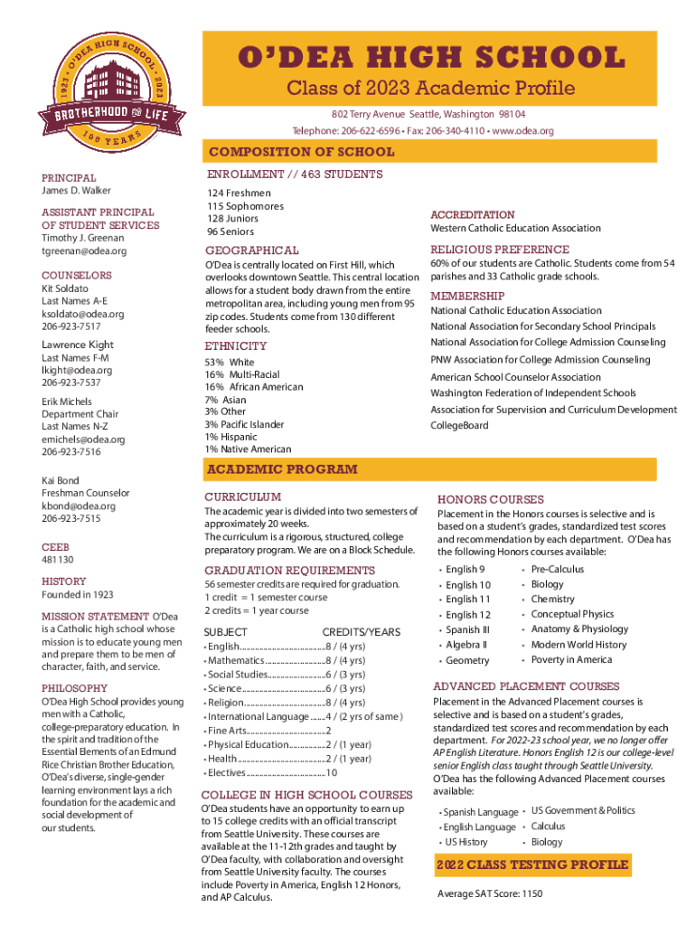 IDEA HIGH SCHOOL Class of 2023 Academic Profile 802 Terry Avenue Seattle, Washington 98104 Telephone: 2066226596 Fax: 2063404110 www.odea.orgCOMPOSITION OF SCHOOL PRINCIPAL James D. WalkerENROLLMENT
