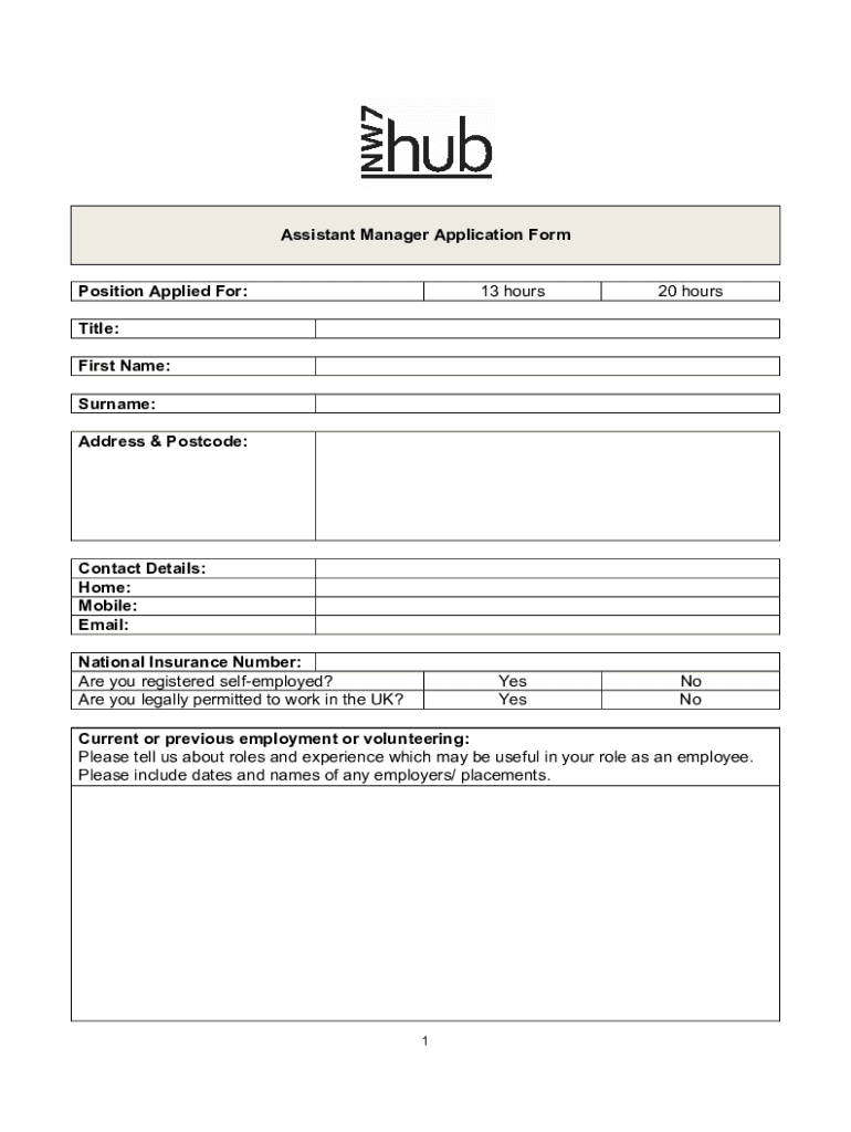 Assistant Manager Application Form Position Applied For:13 hours20 houses Yes No Title: First Name: Surname: Address & Postcode:Contact Details: Home: Mobile: Email: National Insurance Number: Are