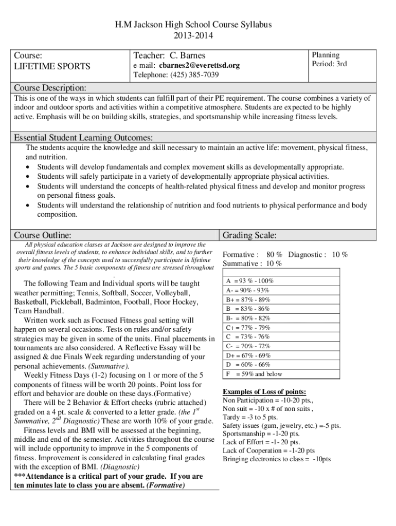 H. M Jackson High School Course Syllabus 20132014 Course: LIFETIME SPORTSTeacher: C. Barnes email: cbarnes2@everettsd.org Telephone: (425) 3857039Planning Period: 3rdCourse Description: This is one