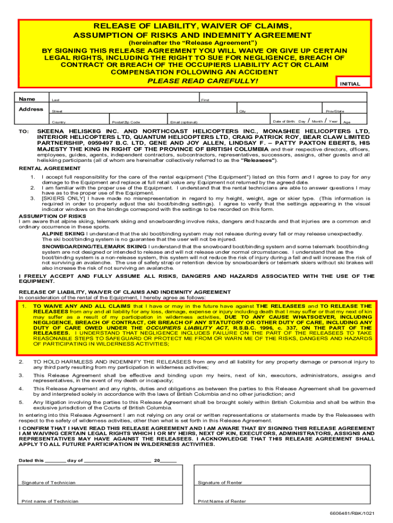 Get the free BY SIGNING THIS RELEASE AGREEMENT YOU WILL WAIVE OR GIVE UP CERTAIN