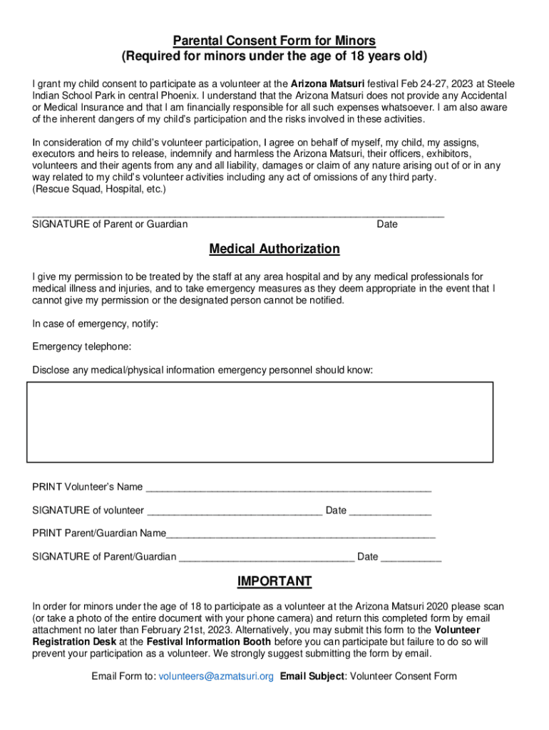 Parental Consent Form for Minors (Required for minors under the age of 18 years old) I grant my child consent to participate as a volunteer at the Arizona Mature festival Feb 2427, 2023 at Steele