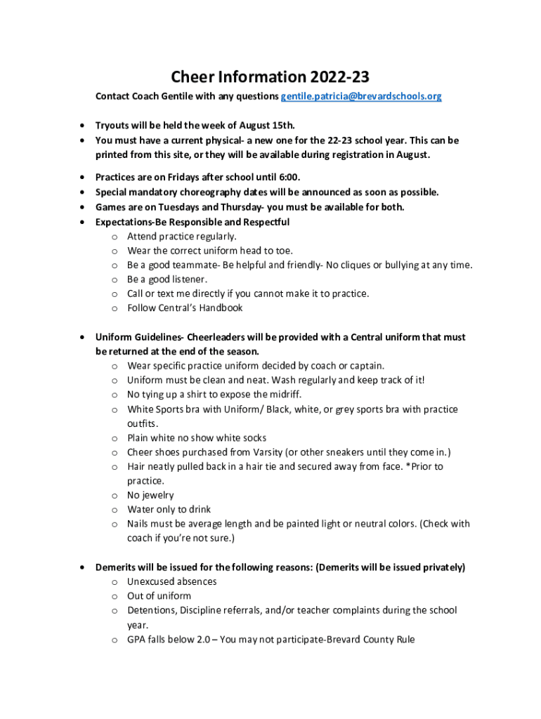 Cheer Information 202223Contact Coach Gentile with any questions gentile.patricia@brevardschools.org Tryouts will be held the week of August 15th. You must have a current physical a new one for the