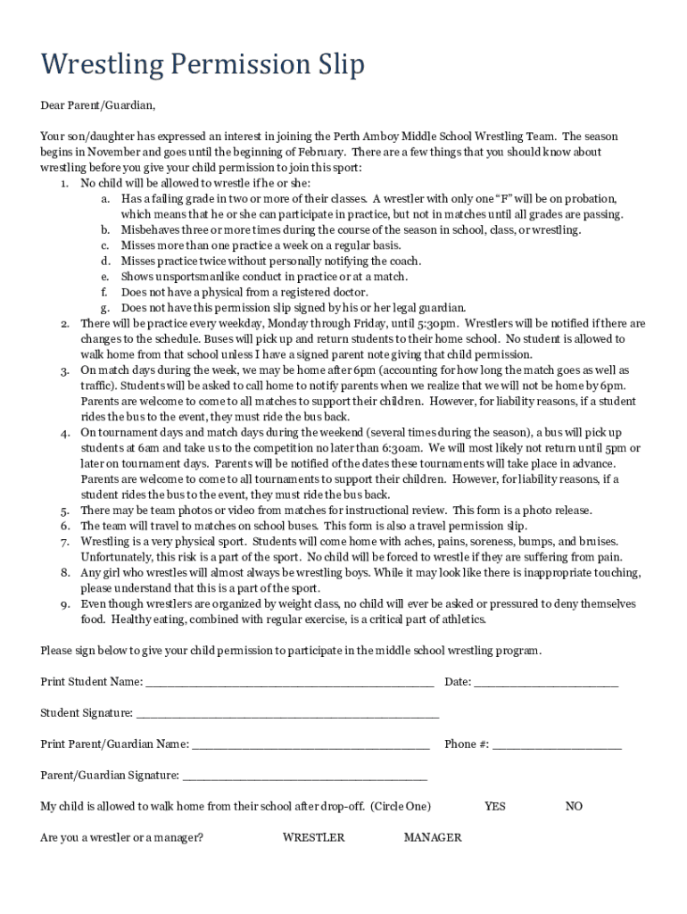 Wrestling Permission Slip Dear Parent/Guardian, Your son/daughter has expressed an interest in joining the Perth Amboy Middle School Wrestling Team. The season begins in November and goes until the