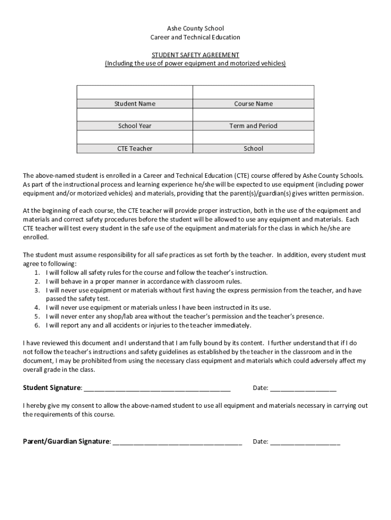 Ashe County School Career and Technical Education STUDENT SAFETY AGREEMENT (Including the use of power equipment and motorized vehicles)Student Racecourse Homeschool Preterm and Period CTE TeacherSchoolThe
