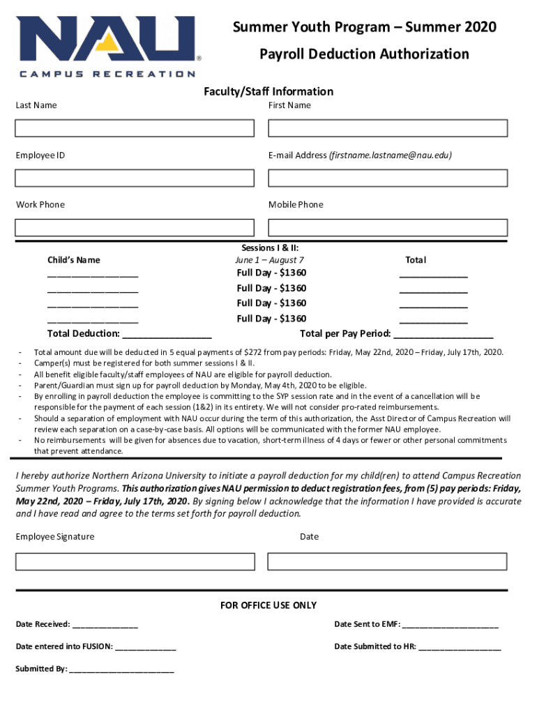 Summer Youth Program Summer 2020 Payroll Deduction Authorization Faculty/Staff Information Last NameFirst NameEmployee IDE mail Address (firstname.lastname@nau.edu)Work Phone Mobile Phonecards Name