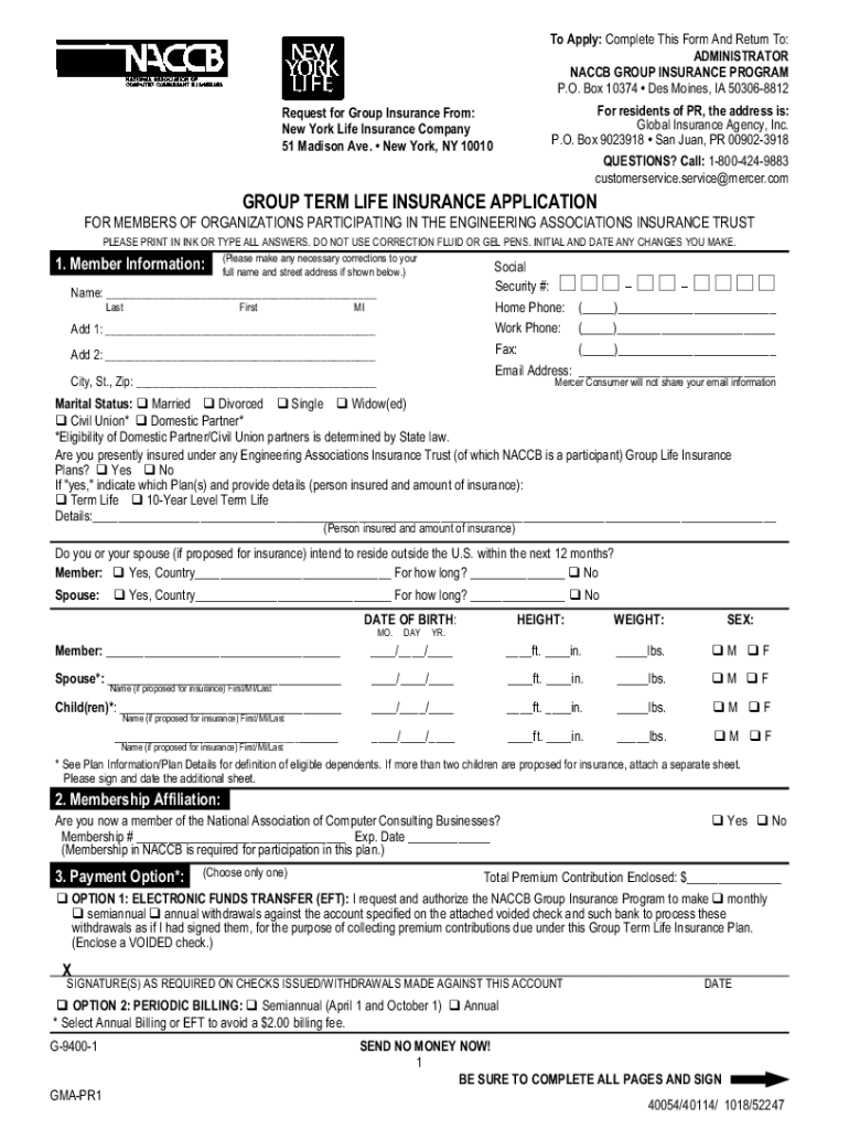 E To Apply: Complete This Form And Return To: ADMINISTRATOR NAC CB GROUP INSURANCE PROGRAM P.O. Box 10374 Des Moines, IA 503068812 For residents of PR, the address is: Global Insurance Agency, Inc.