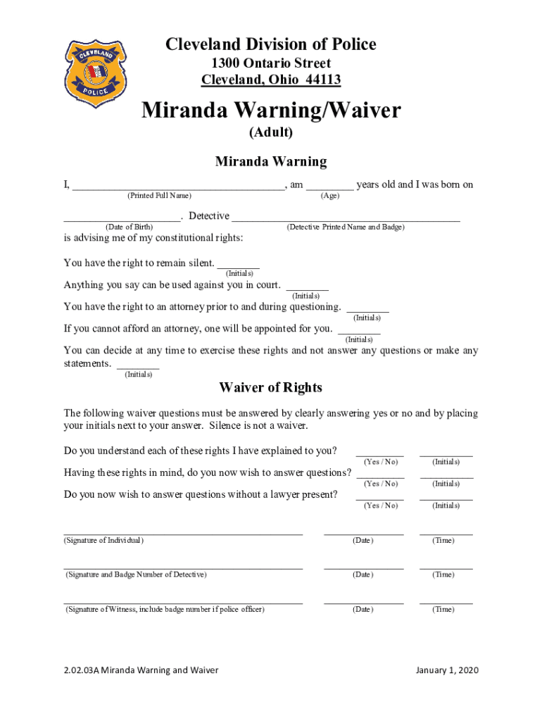 Cleveland Division of Police 1300 Ontario Street Cleveland, Ohio 44113Miranda Warning/Waiver (Adult)Miranda Warning I, ___, am ___ years old, and I was born on (Printed Full Name)(Age)___. Detective