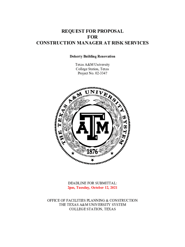 REQUEST FOR PROPOSAL FOR CONSTRUCTION MANAGER AT RISK SERVICES Doherty Building Renovation Texas A&M University College Station, Texas Project No. 023347DEADLINE FOR SUBMITTAL: 2pm, Tuesday, October