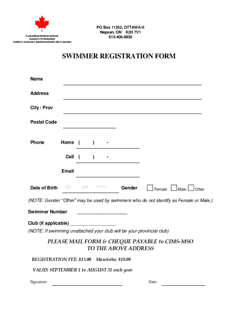 PO Box 11352, OTTAWA H Repeat, ON K2H 7V1 6134068930SWIMMER REGISTRATION FORM Name Address City / Prov Postal CodePhoneHome ()Cell ()Mandate of BirthDDMMYYYYGenderFemaleMaleOther(NOTE: Gender Others