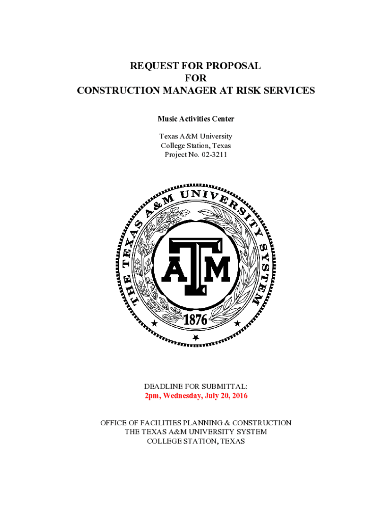 REQUEST FOR PROPOSAL FOR CONSTRUCTION MANAGER AT RISK SERVICES Music Activities Center Texas A&M University College Station, Texas Project No. 023211DEADLINE FOR SUBMITTAL: 2pm, Wednesday, July 20,