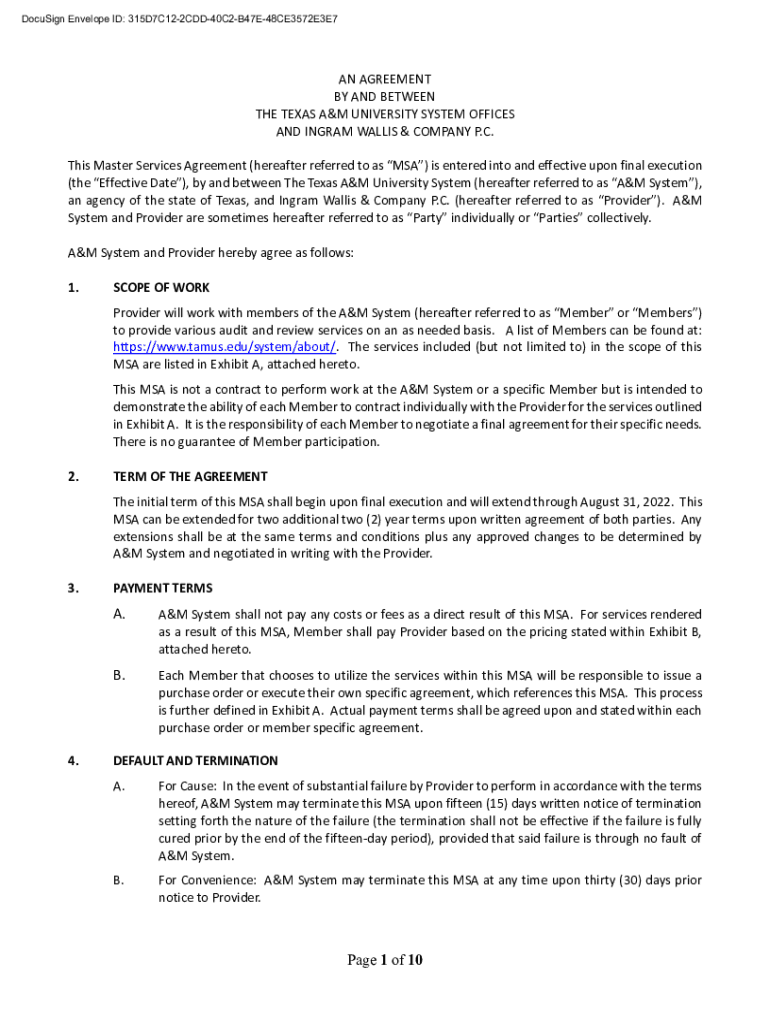 DocuSign Envelope ID: 315D7C122CDD40C2B47E48CE3572E3E7AN AGREEMENT BY AND BETWEEN THE TEXAS A&M UNIVERSITY SYSTEM OFFICES AND INGRAM WALLIS & COMPANY P.C. This Master Services Agreement (hereafter