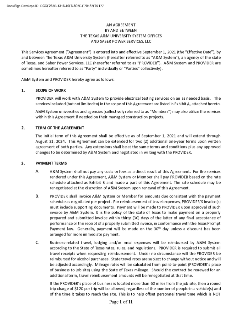 DocuSign Envelope ID: DCCF267B131640F6807EF70187F97177AN AGREEMENT BY AND BETWEEN THE TEXAS A&M UNIVERSITY SYSTEM OFFICES AND SABER POWER SERVICES, LLC This Services Agreement (Agreement) is entered