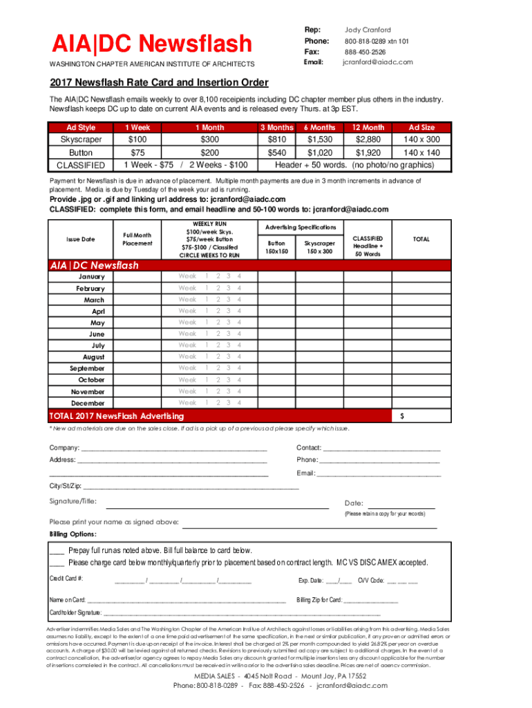 AIR|DC Newsflash Rep:Jody CranfordPhone: Fax:8008180289 ATN 101Email:WASHINGTON CHAPTER AMERICAN INSTITUTE OF ARCHITECTS8884502526 jcranford@aiadc.com2017 Newsflash Rate Card and Insertion Order The