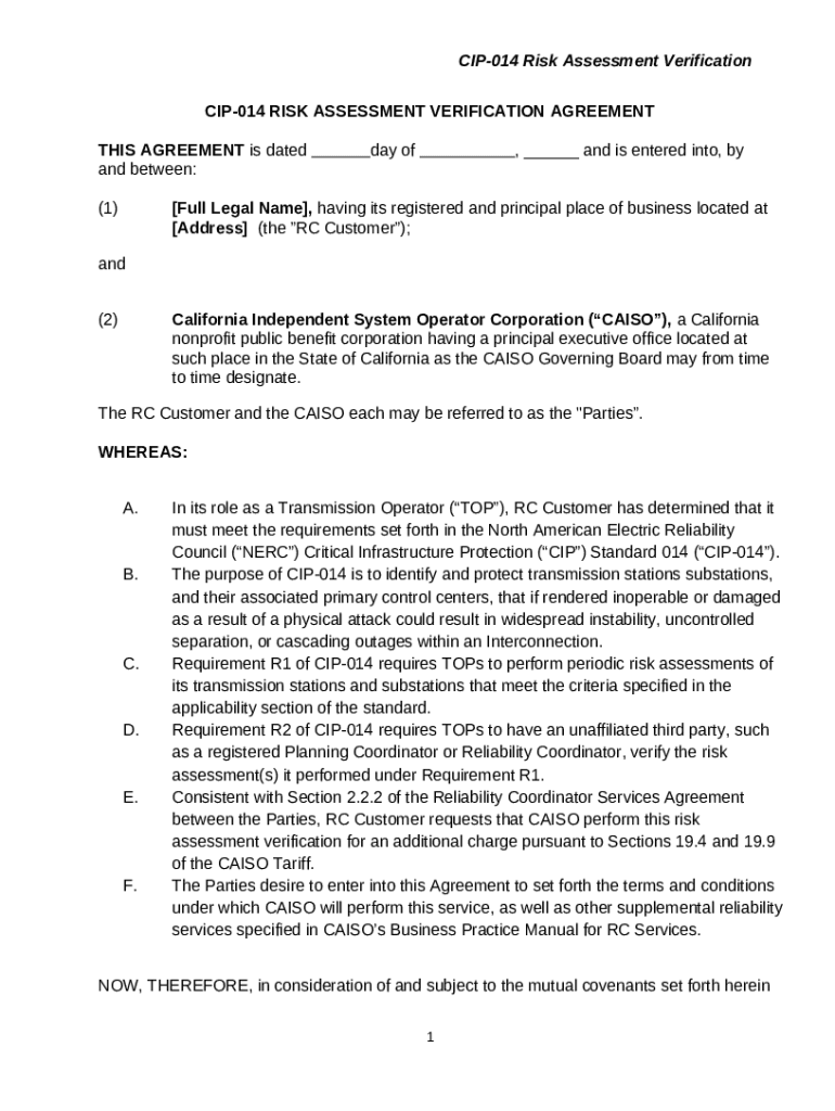 How to fill CIP-014 NERC Reliability Standard Risk Assessment Agreement word template