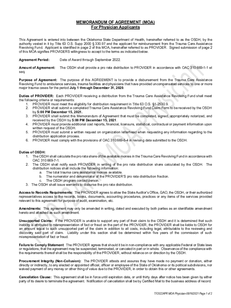 MEMORANDUM OF AGREEMENT (MOA) For Physician Applicants This Agreement is entered into between the Oklahoma State Department of Health, hereinafter referred to as the OSD, by the authority vested in
