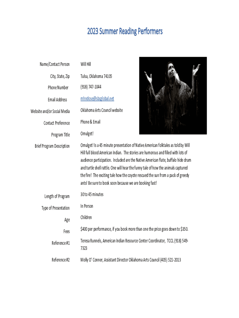 2023 Summer Reading PerformersName/Contact Person City, State, Zip Will Hill Tulsa, Oklahoma 74105Phone Number(918) 7471044Email Addressmhndose@sbcglobal.netWebsite and/or Social Media Contact Preference